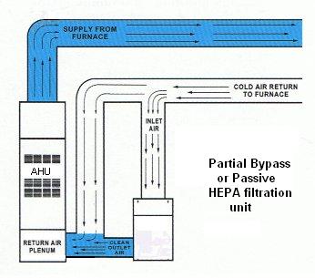 Passive HEPA air filtration system Another style of high efficiency air cleaners is the passive, or "partial bypass", configuration. This type sits to the side of your air handler and is ducted into the return ductwork in 2 locations. This unit cleans a percentage of your indoor air at all times, if you have your thermostat set on fan. This unit is especially effective as an addition to a variable speed furnace or air handler. Stale contaminated air is drawn into the unit, passes through a pre-filter and then a HEPA filter, before passing by the ultra-violet light, and then is redistributed back into the home.