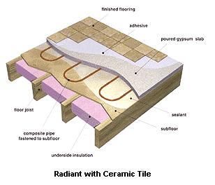 Whether your radiant floor heating is an electric system or a hydronic system, the best performance can be achieved by installation over or imbedded in a thermal mass (concrete or gypcrete), and then a ceramic tile floor finish laid over the system.